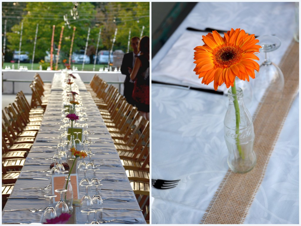 Sfumature quasi fluo per le maxi gerbere arancio e fucsia, abbinate a dettagli verde acido per ravvivare le lunghe tovaglie di fiandra con runner in iuta.