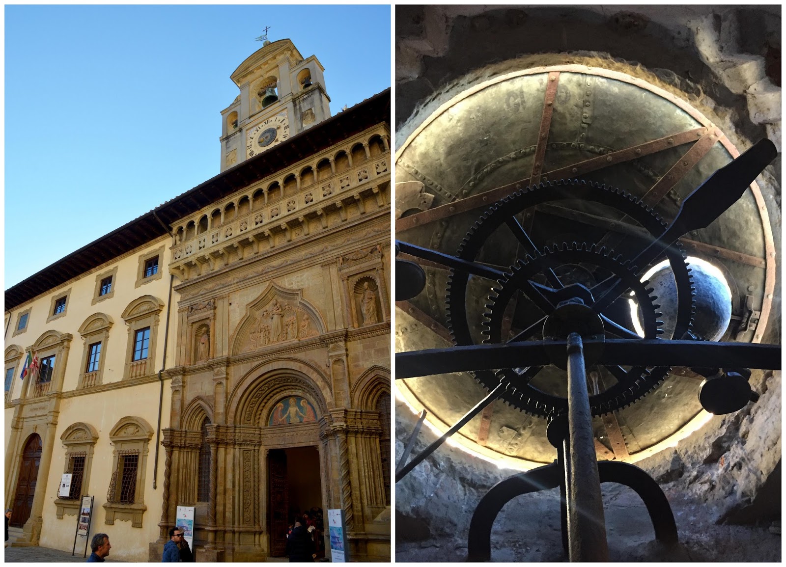 Qui ci siamo arrampicati fino in cima alla torre da cui si gode di una vista meravigliosa sulla piazza e sull’intera città, ma soprattutto si possono ammirare gli ingranaggi dell’orologio astronomico posto nella vela campanaria disegnata da Giorgio Vasari.